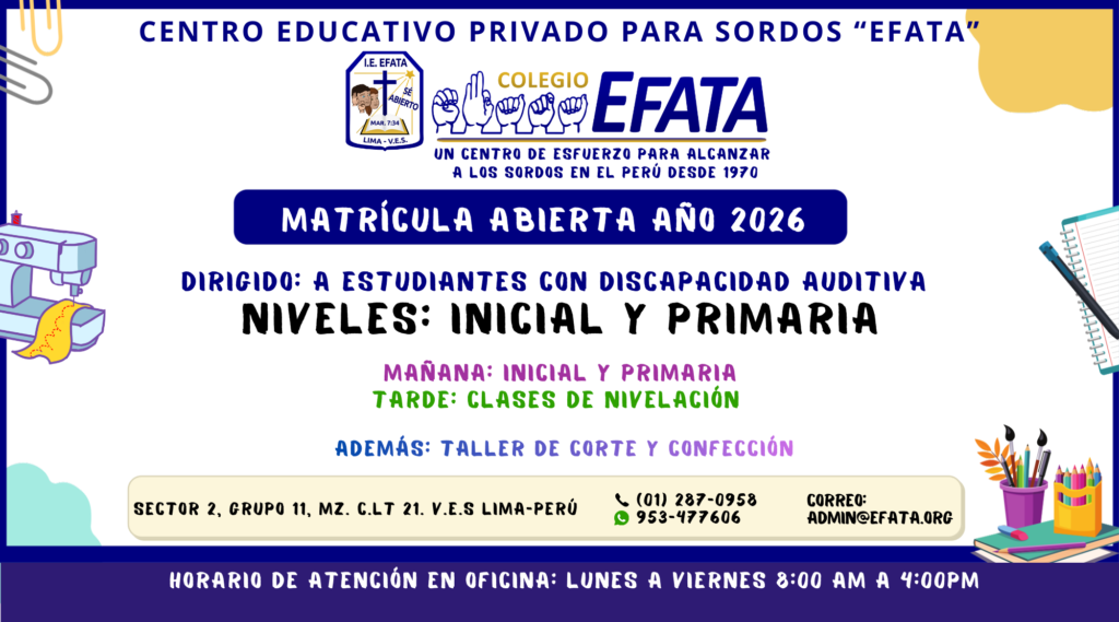 Fundado en 1968 por un misionero sordo, Efata fue el primer colegio a nivel nacional en enseñar en la lengua de señas peruana.